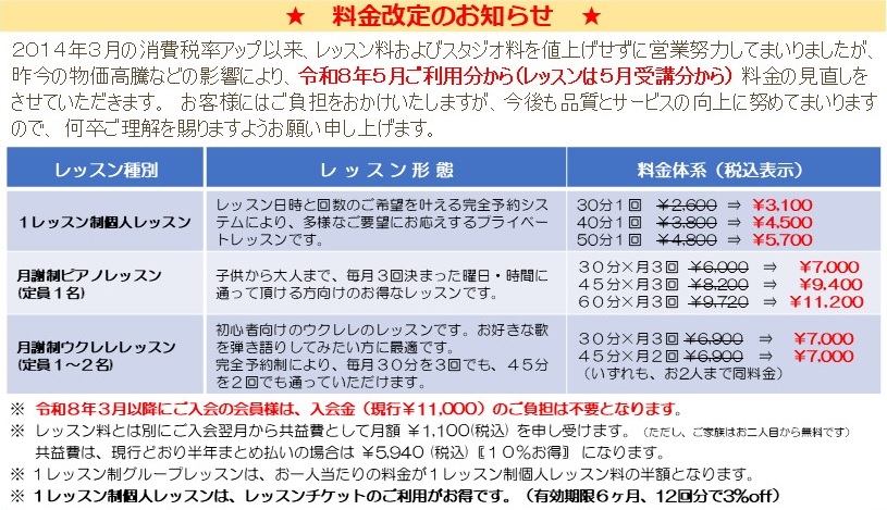 初心者向けのウクレレのレッスンです。お好きな歌を弾き語りしてみたい方に最適です。 完全予約制により、毎月30分を3回でも、45分を2回でも通っていただけます。 詳しくは こちら 30分×月3回 ¥6,900(税込、お2人まで同料金) 45分×月2回 ¥6,900(税込、お2人まで同料金) (入会金免除、通常 ¥1,100 の共益費を含みます) |