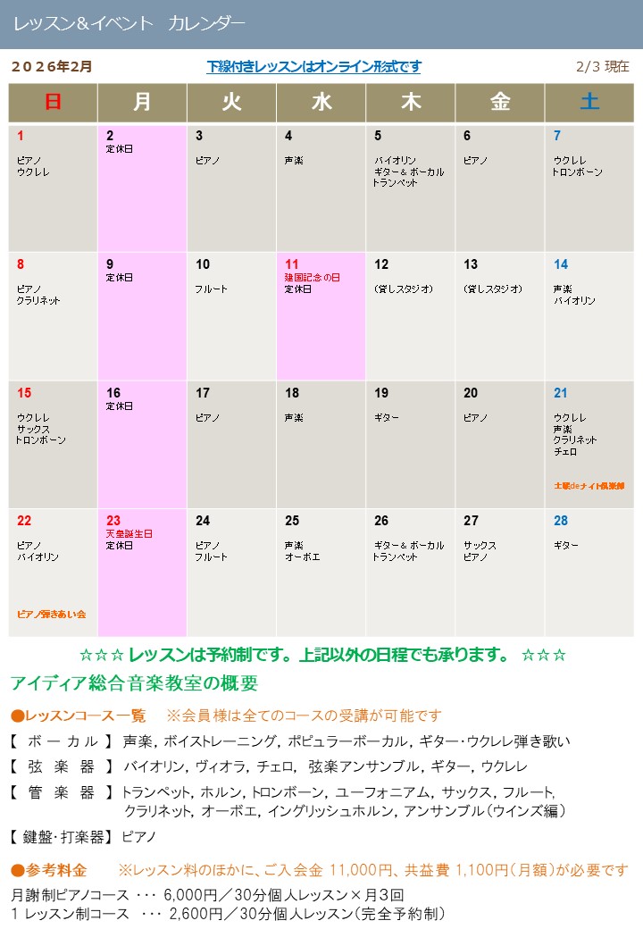 | HOME 概要 レッスン予定表 2026年1月 2026年2月 レッスン料金体系とご利用方法 アクセス お問い合わせ |