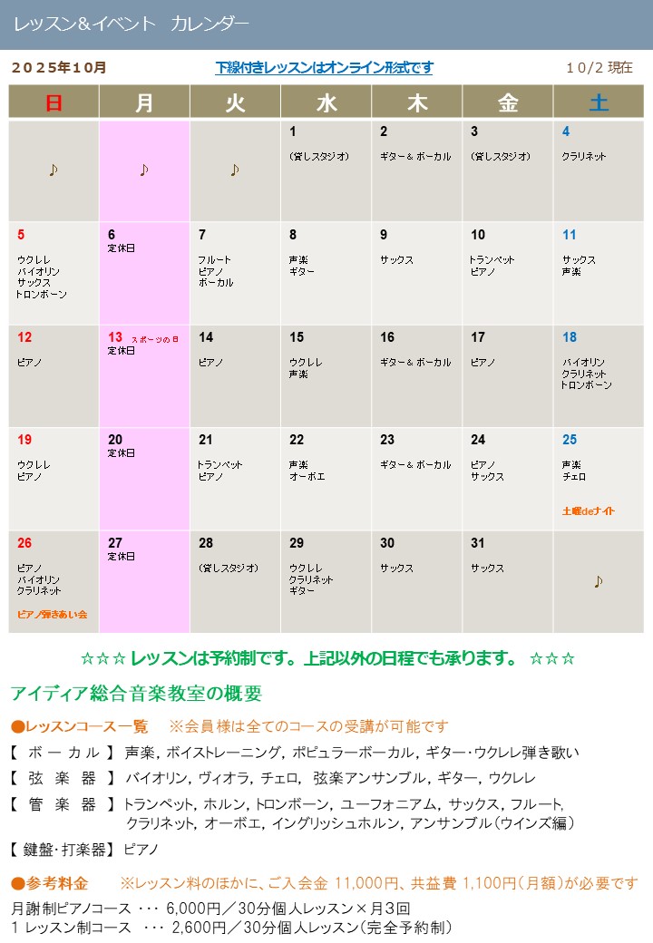 HOME 概要 レッスン予定表 2025年9月 2025年10月 レッスン料金体系とご利用方法 アクセス お問い合わせ |